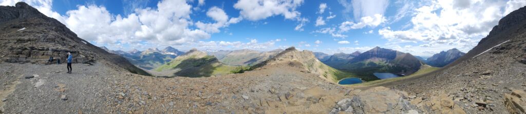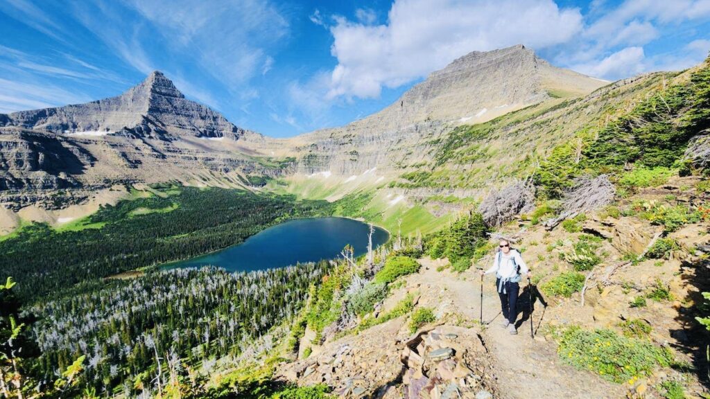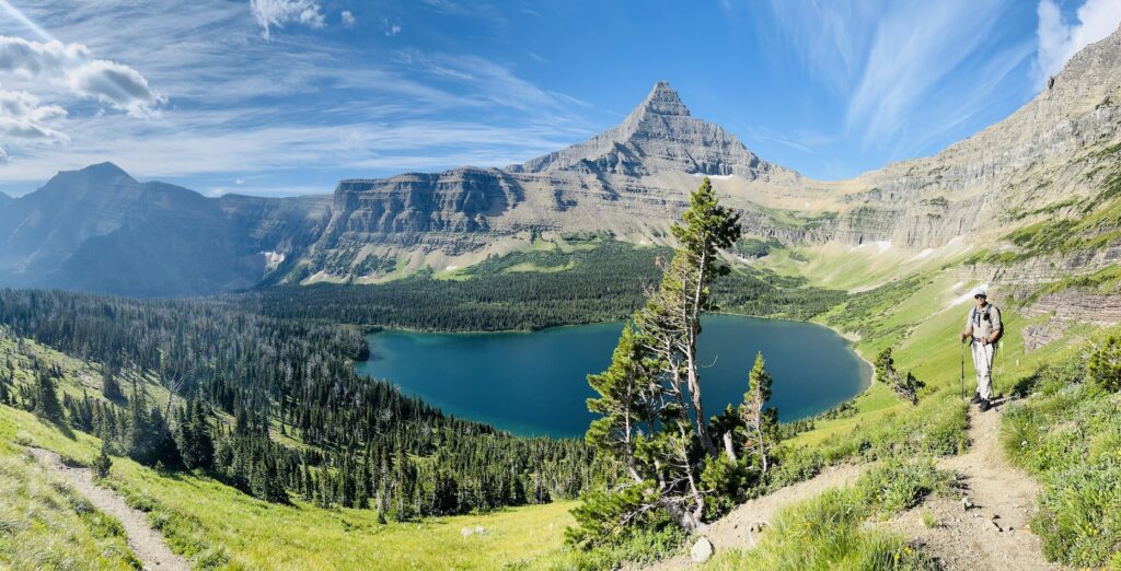 Starting at Pray Lake, we took the counterclockwise route. The early miles were fairly easy, winding through forest and alpine meadows before becoming steep with a series of switchbacks. As we climbed, we caught our first glimpse of Old Man Lake below us. At Pitamakan Pass, the trail opened up into a stunning panorama of two more lakes, Pitamakan and Morning Star.