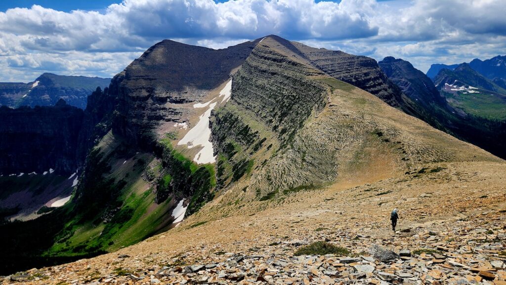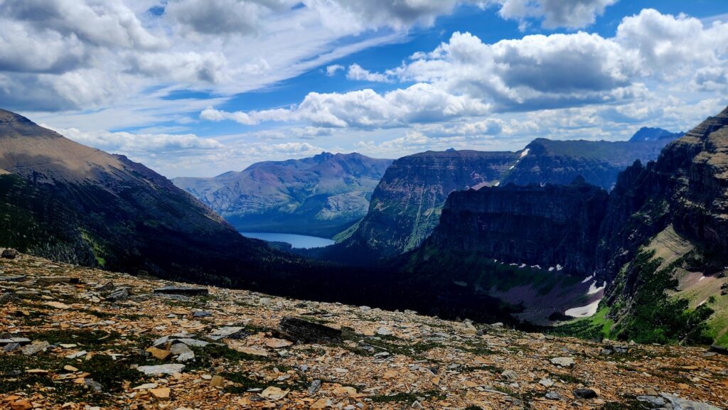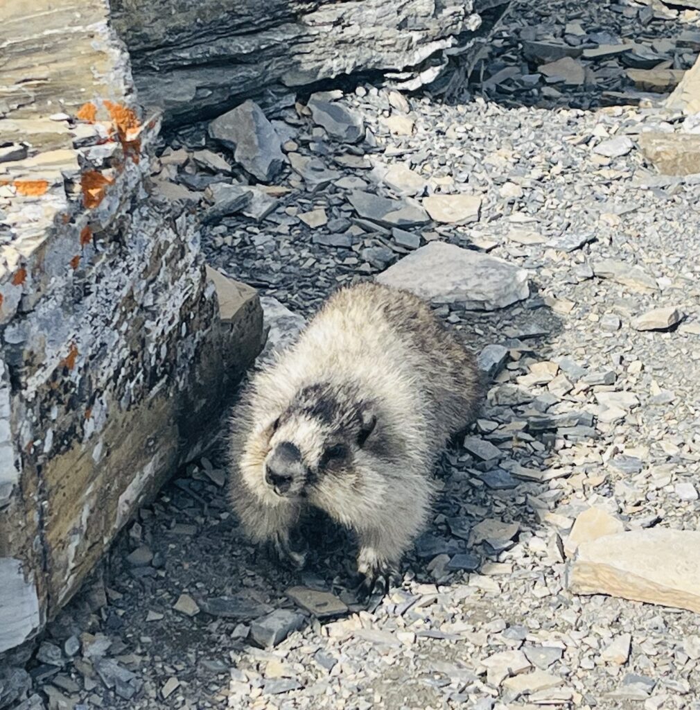 From there, we headed towards Pitamakan Overlook and saw several big horn sheep and baby big horn sheep! We sat to eat a snack, and I made friends with a curious marmot. After our short break, we skirted along narrow scree-covered ledges around the backsides of Mount Morgan and Flinsch Peak, staring down into a vast, beautiful valley below. It was windy across the exposed ridges, but the views of jagged peaks and endless sky were amazing.