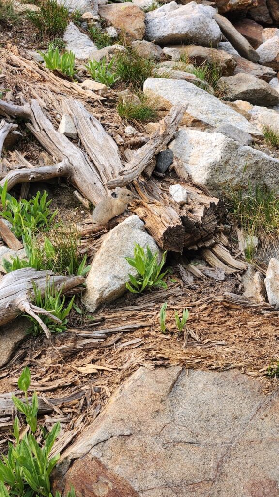 From miles 3 to 6, the trail climbed steadily through dense forest and into rocky terrain until we reached the stunning alpine basin of Holly Lake. We took a much-needed break, ate our first sandwiches, and took in the view. Just as we got back on the trail, we spotted a fox carrying his kill, a pine marten. He was unbothered by our presence, although I moved on when things got a bit graphic, but Matt caught it on video if you’re curious.